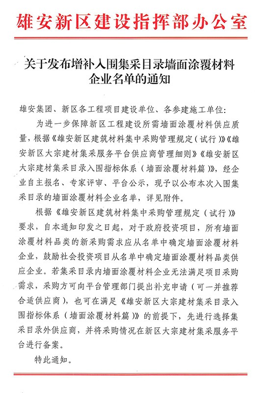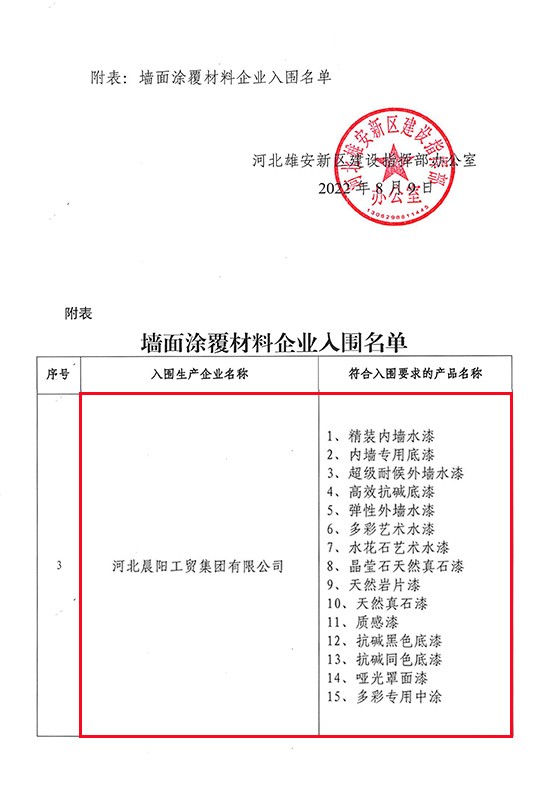 2022年8月9日,雄安新區(qū)建設指揮部辦公室發(fā)布了《關于發(fā)布增補入圍集采目錄墻面涂覆材料企業(yè)名單的通知》。據(jù)墻面涂覆材料企業(yè)入圍名單顯示:河北晨陽工貿(mào)集團有限公司(以下簡稱“晨陽水漆”)共計有15款內外墻環(huán)保水漆產(chǎn)品入選。
